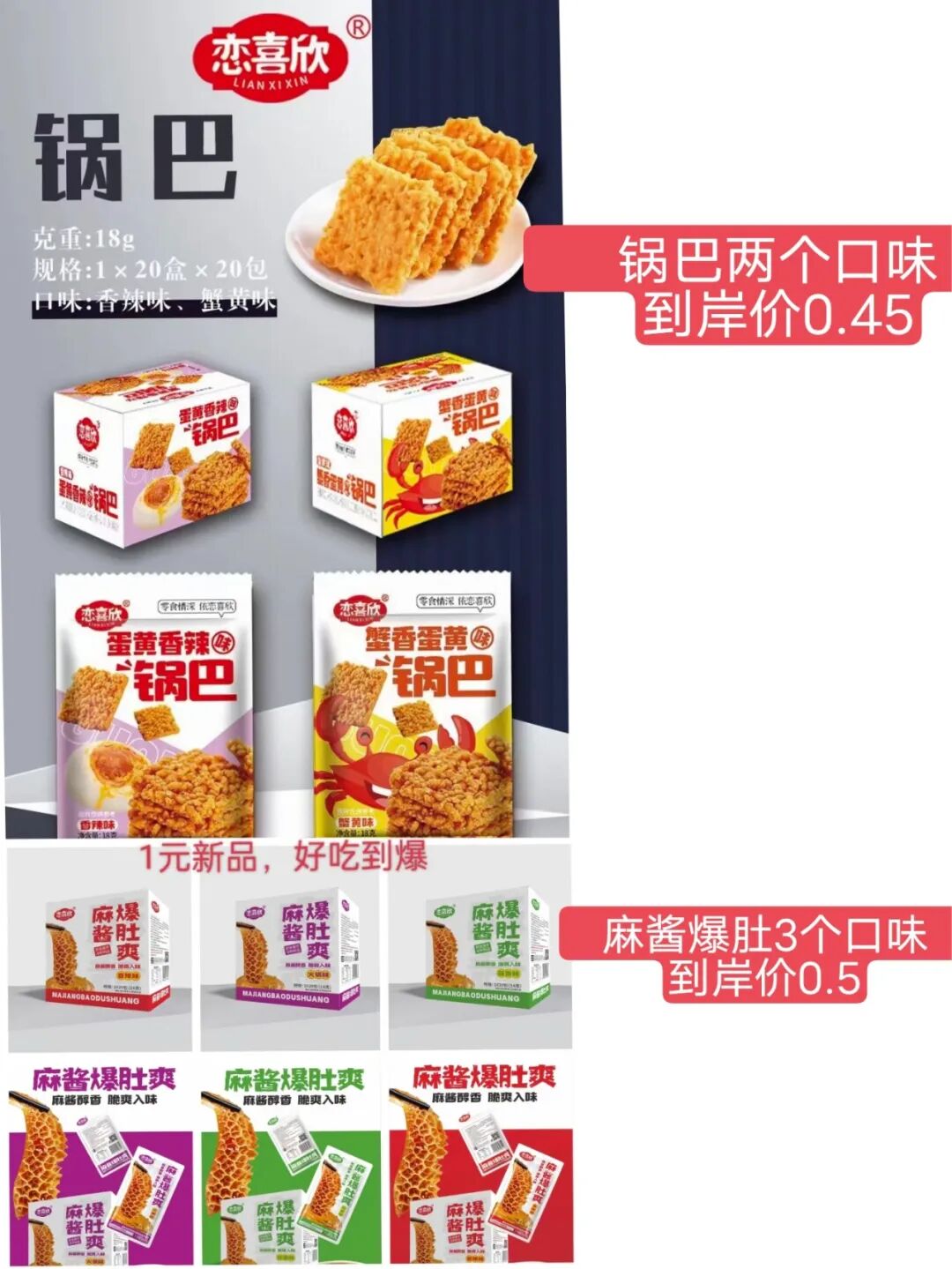 1元系列:山椒笋·鸭肠·小鱼仔·大牛排·脆骨·鱿鱼·脱骨猪蹄·猪肉脯·辣子鸡·火锅毛肚·耳尖·鸭肠·脆角系列;2元系列:鸭锁骨·卤翅·烤鸡蛋·鸭腿·脖子·辣条·蒟蒻果冻系列