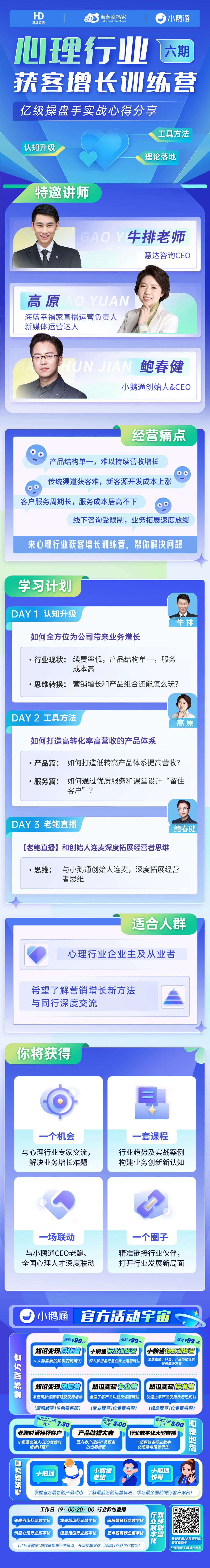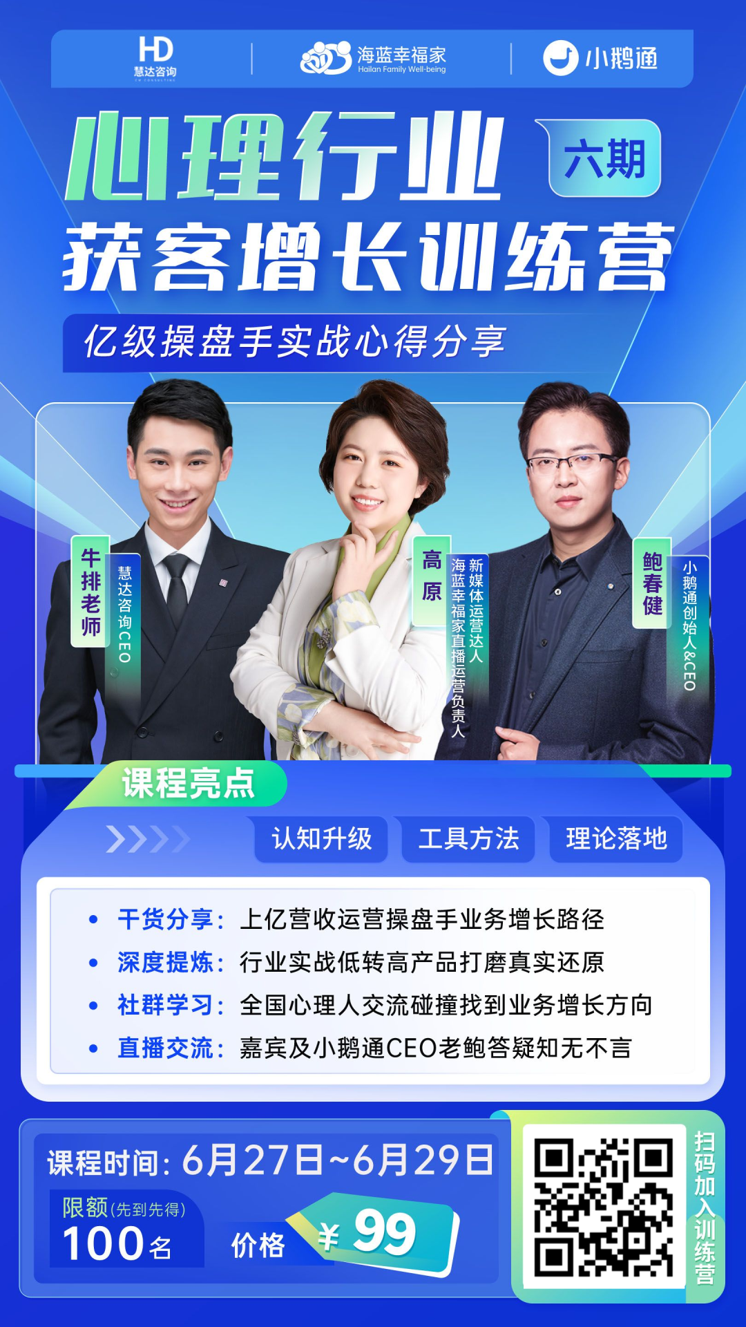结合小鹅通许多优秀的心理行业客户案例,还有数十位心理行业头部IP的访谈,这回,我们特别定制「心理行业获客增长训练营」。