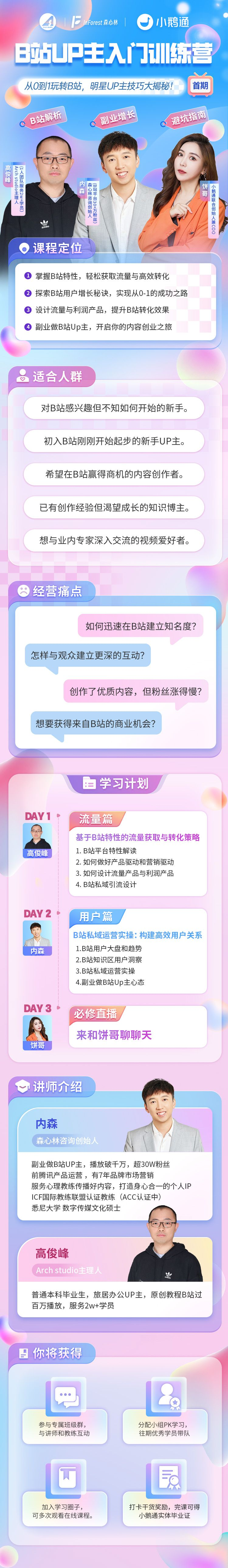 所以,继我们推出了「小红书爆款种草训练营」、「抖音内容运营增长训练营」、「视频号IP变现训练营」等爆款运营攻略之后,许多盆友就表示,那么多知识变现大咖都在玩B站,怎么能少了B站训练营?马上安排!
