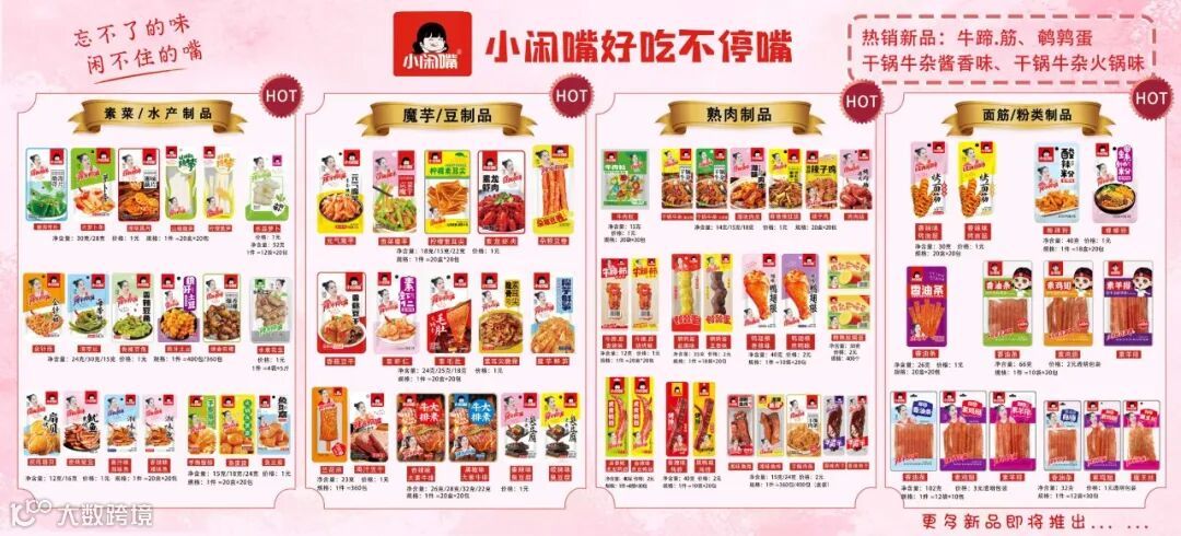 一至三元定量装麻辣休闲小零食;『销售渠道』:学校·流通·便利店·商超等;『产品分类』:七大类,品类齐全;『其它介绍』:专注低价位高品质零食,广泛适用多元消费场景