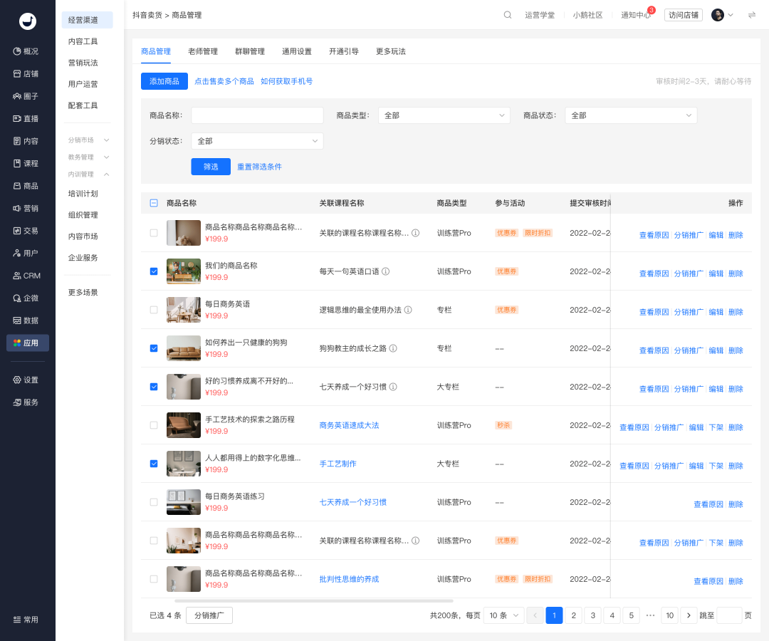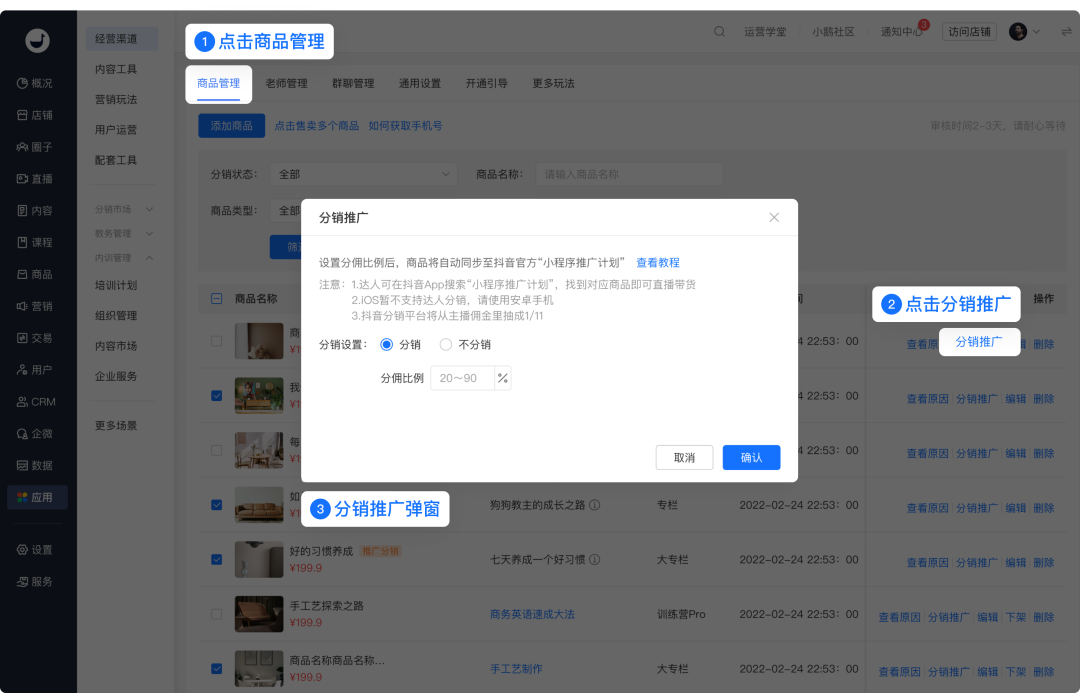 可在小鹅通后台查看抖音商品参与了哪些营销活动。