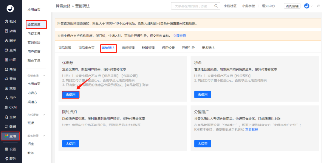 在小鹅通管理台「抖音卖货」页面选择营销工具,点击【去使用】,跳转到对应的营销工具页面。