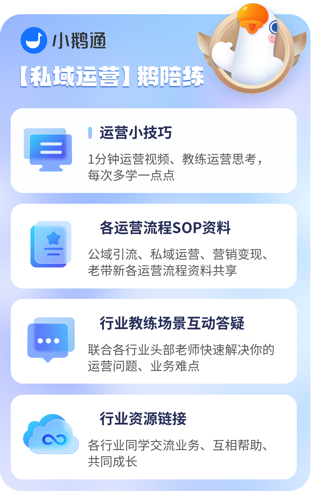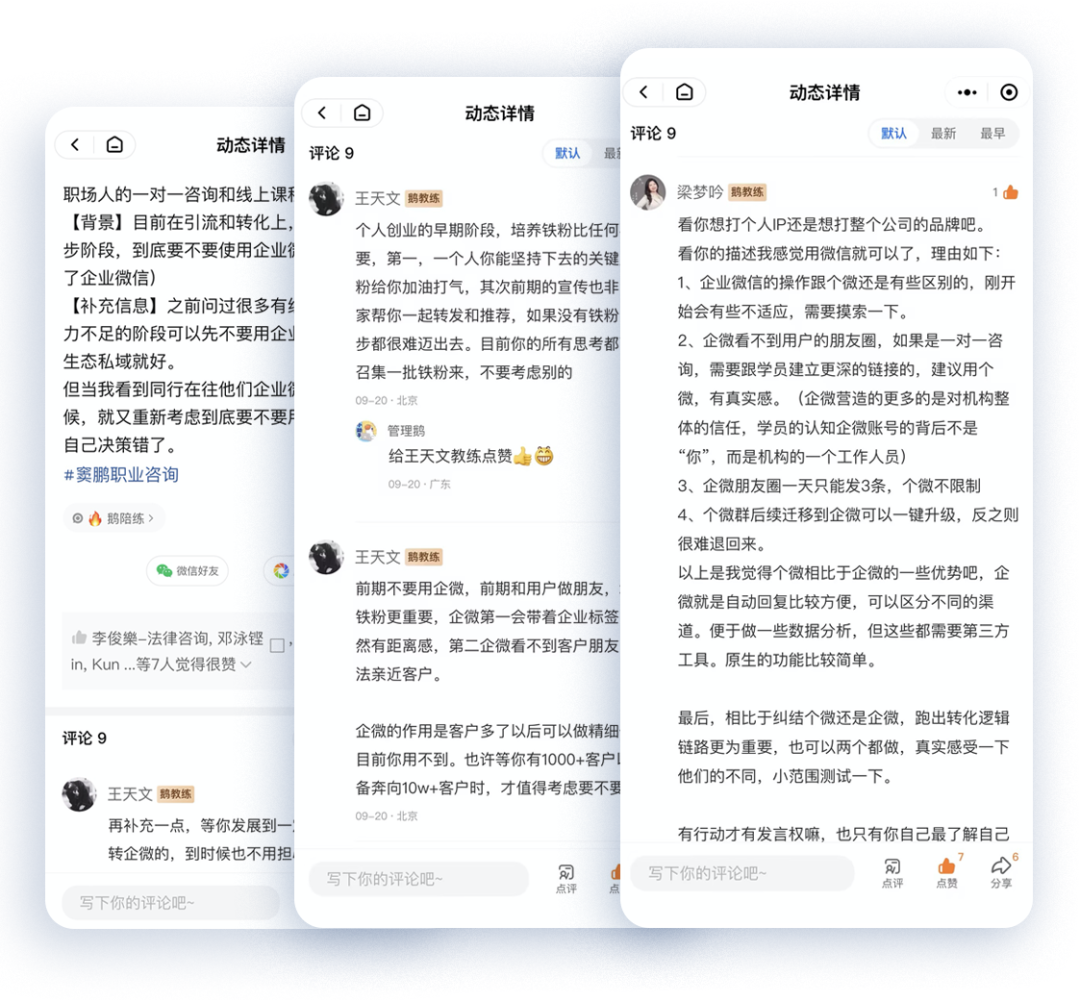无论你是刚刚起步的个人商家,还是希望提升现有运营技能的从业者、创始人,只要你正在做线上运营,还是只是对线上运营感兴趣,都可以加入“鹅陪练”圈子当中,还有更多来自不同行业、不同阶段的精选问答,通通都是身边的案例,快加入我们一起同行!