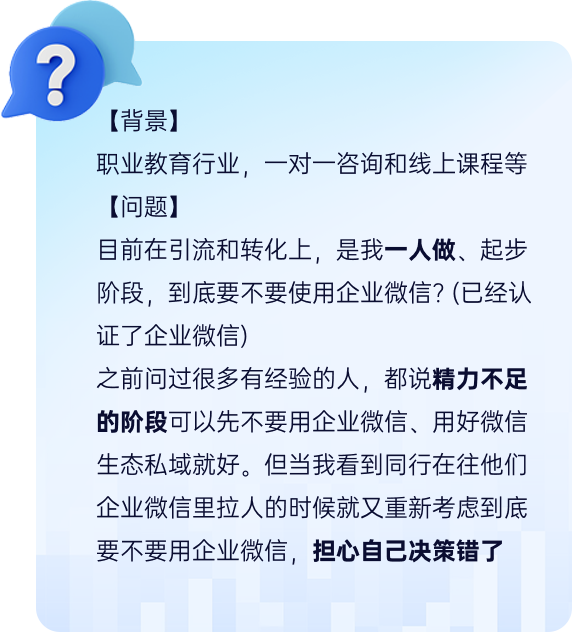 前期不要用企微,和用户做朋友,培养一批铁粉更重要,企微第一会带着企业标签,用户天然有距离感,第二企微看不到客户朋友圈,没办法亲近客户。
