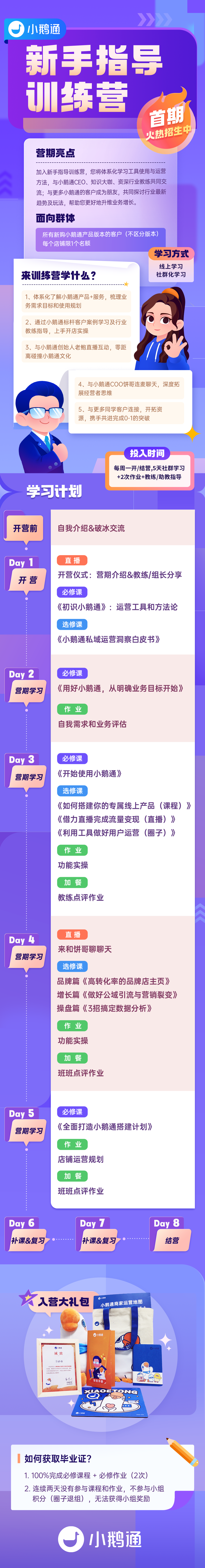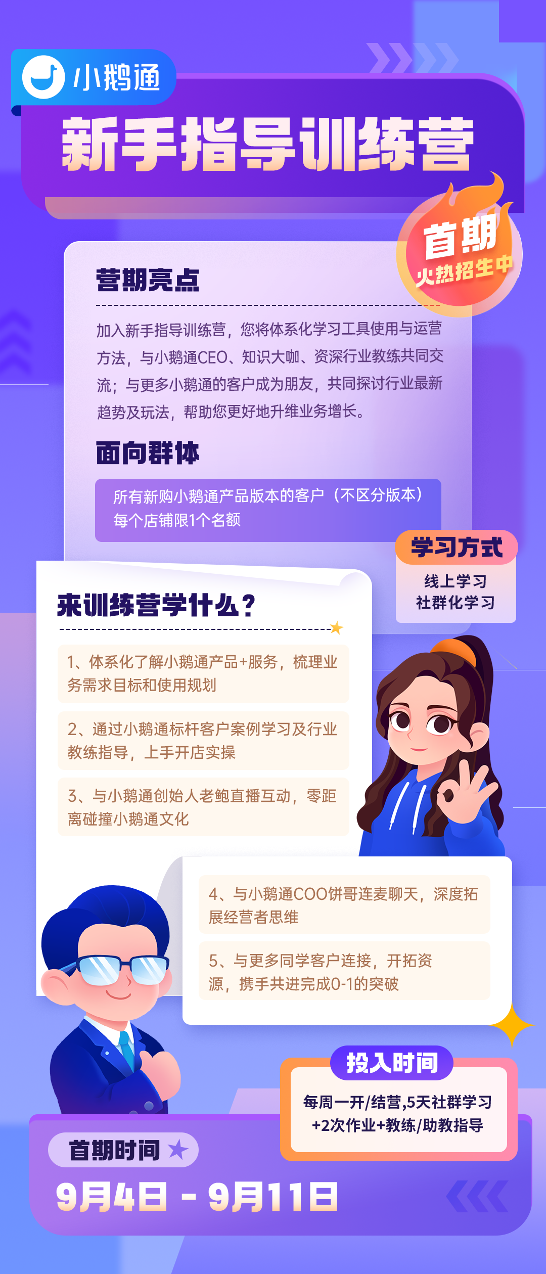 本《新手指导训练营》将向所有购入小鹅通SaaS产品的新购客户全面开放。自9月4日起购入小鹅通产品的新客户,均可与您的客户经理或服务管家沟通入营,完成新手起步的体系化指导服务。