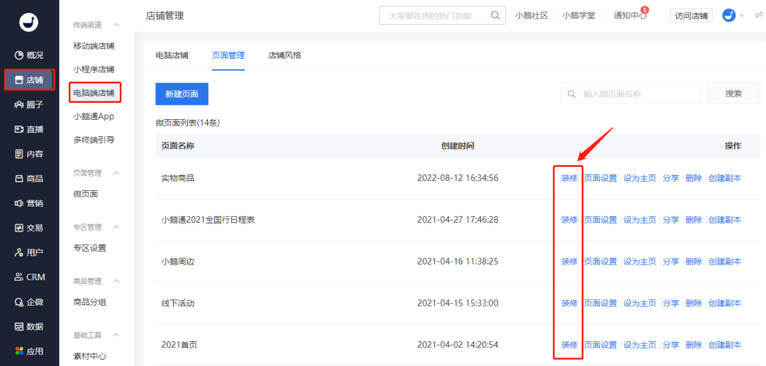小鹅通管理台 - 店铺 - 电脑端店铺 - 页面管理 - 装修