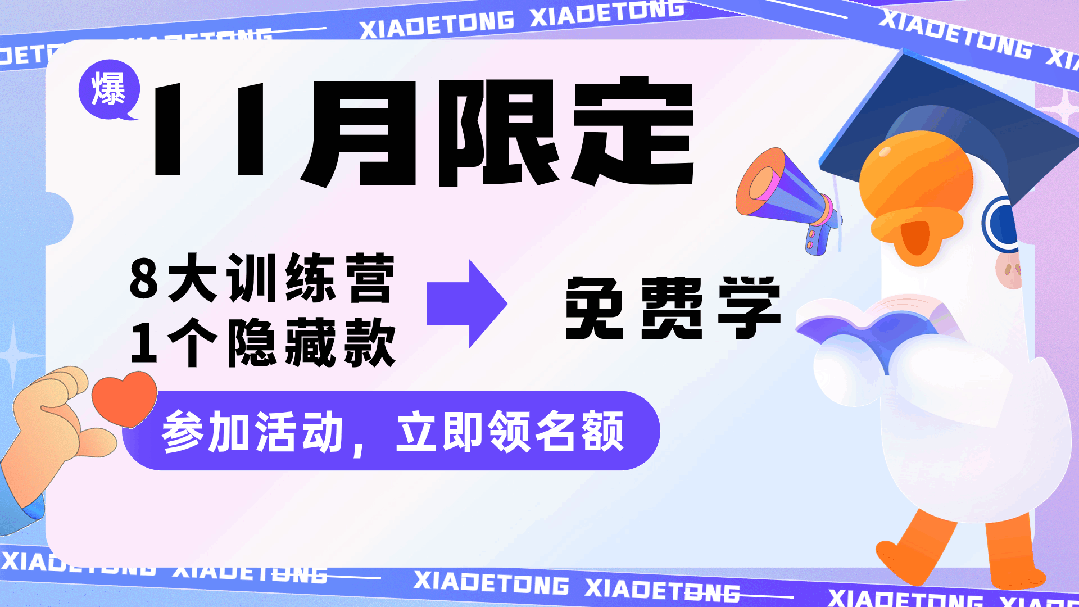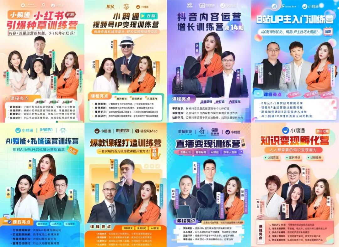 即日起到11月17日12:00,小鹅通小红书、视频号、抖音、AI、直播、B站、知识IP孵化、爆款课程打造等八大场景主题热门训练营,免费学!
