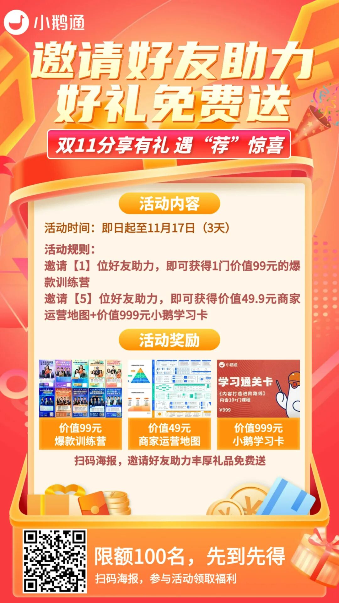 邀请5名好友还可额外获得【价值千元的“商家运营地图+小鹅学习卡”】。