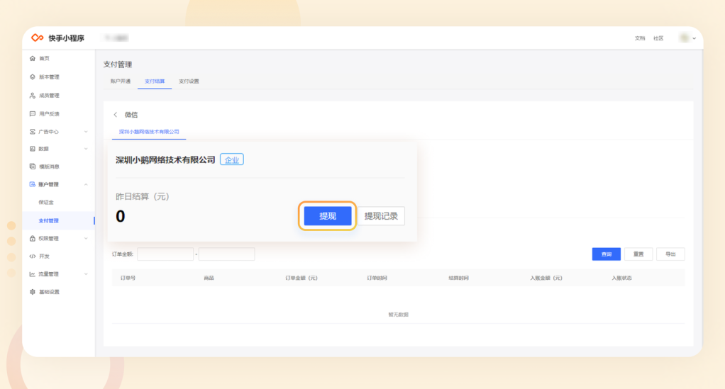 「快手」与小鹅通店铺深度结合,你可以在店铺后台看到「快手」上的订单数据。同时,能在「快手」小程序上实时看到收入金额,点击秒提现!