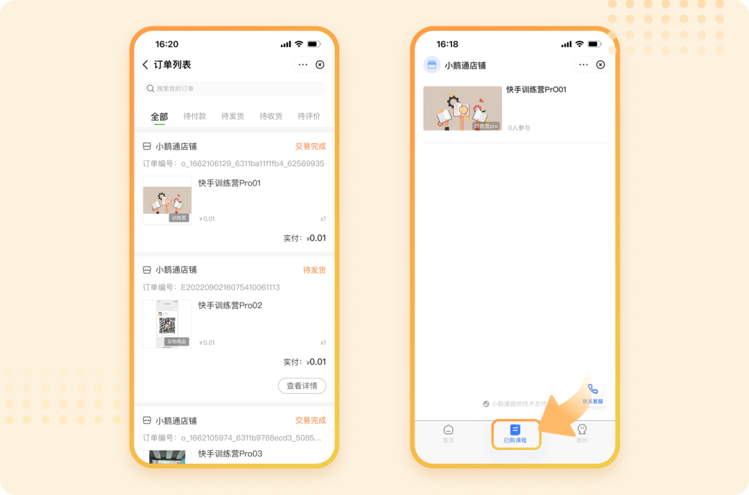 当你的用户通过内容种草后,可以立刻在「快手」直播间、短视频、主页进行下单。购买课程后,在快手和微信均可学习。