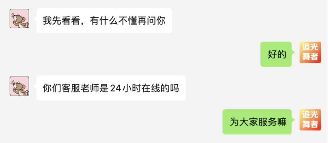 朱老师兼任客服时,凌晨也会回信息,他说:“只要睁着眼你就服务,不会去计较现在是不是上班时间。”创始人先要百分之百投入,再带动团队百分之百投入。