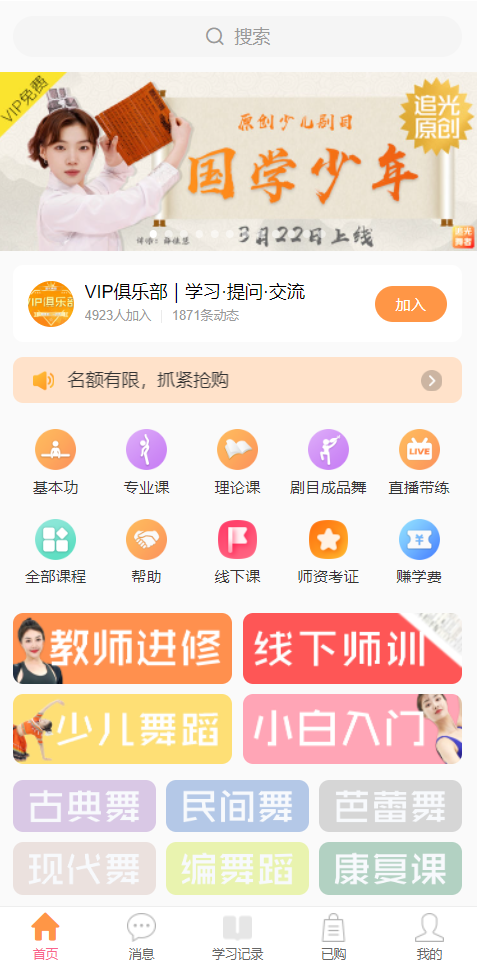 「追光舞者」的年度会员能畅听所有课程,精品课365天不停更,直播课每晚7点准时带练。