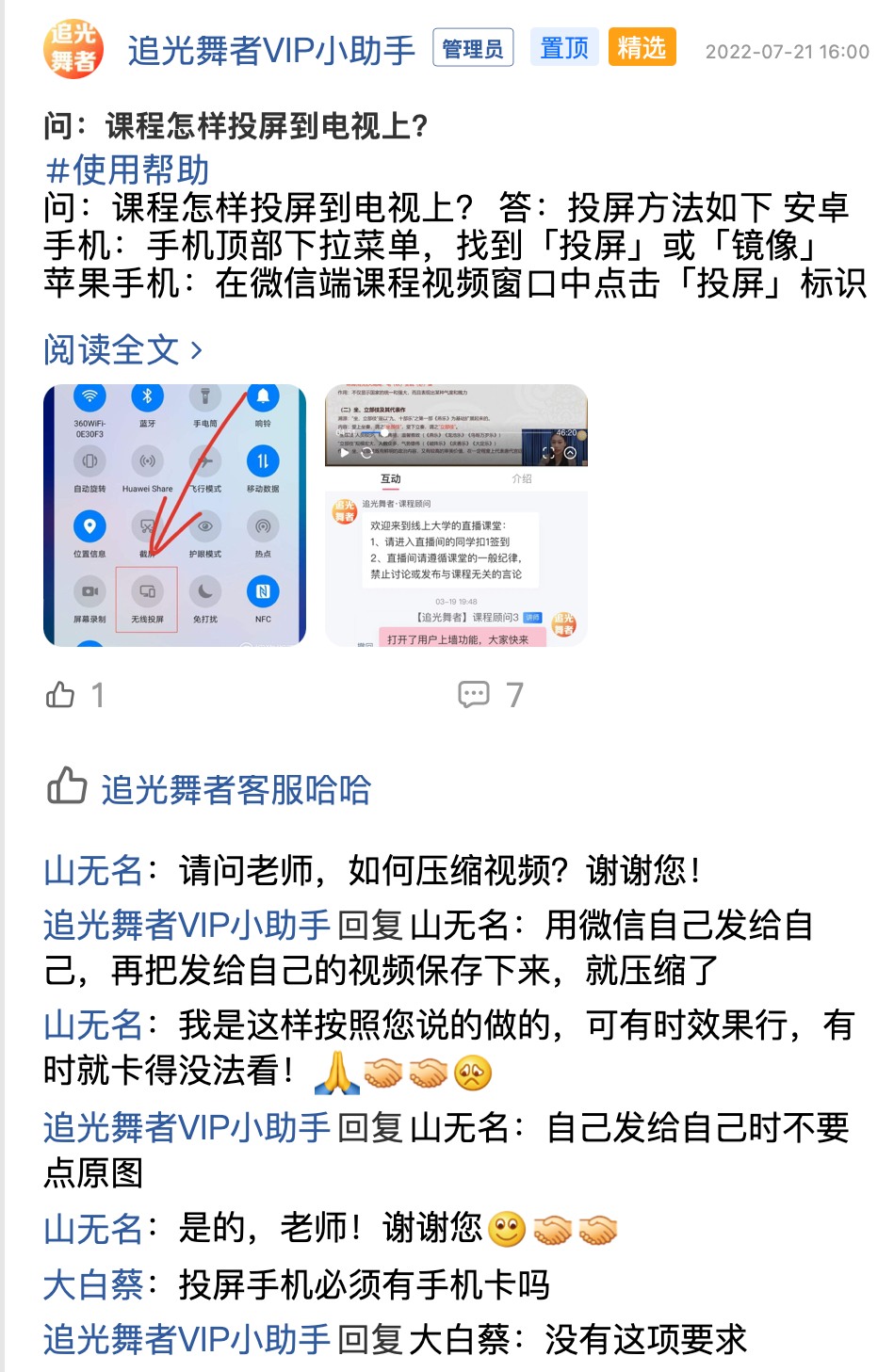 除了精品课,「追光舞者」还提供了社群打卡、圈子问答、在线考试等课后服务。而且制定了高服务标准:用户的提问,要用最快速度响应。