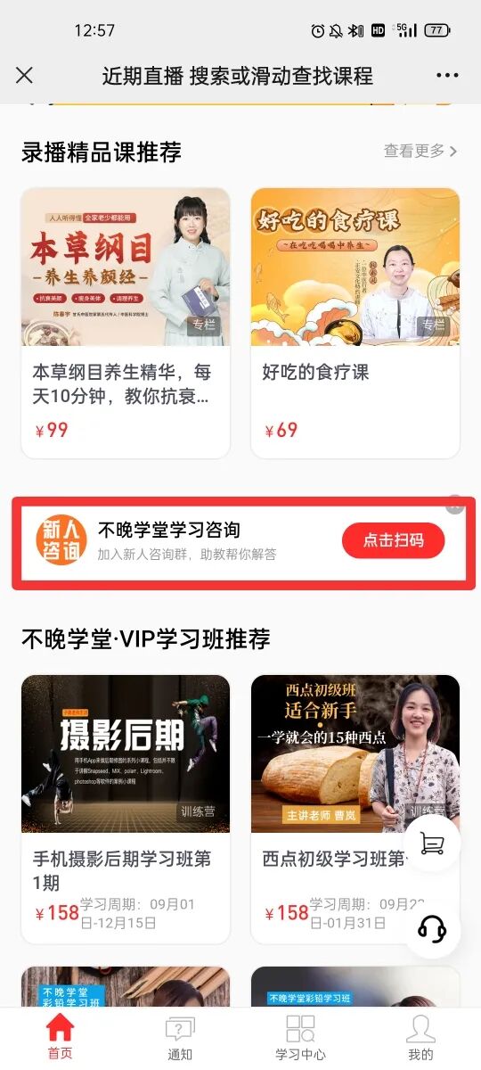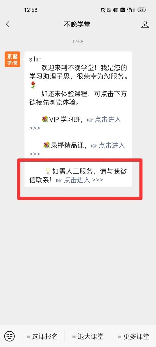 「不晚学堂」有很多学习群,现在有课程上新就能直接把链接发到群内。学员无需下载app打开网页,只用拿出手机,打开课程就能开始学习。