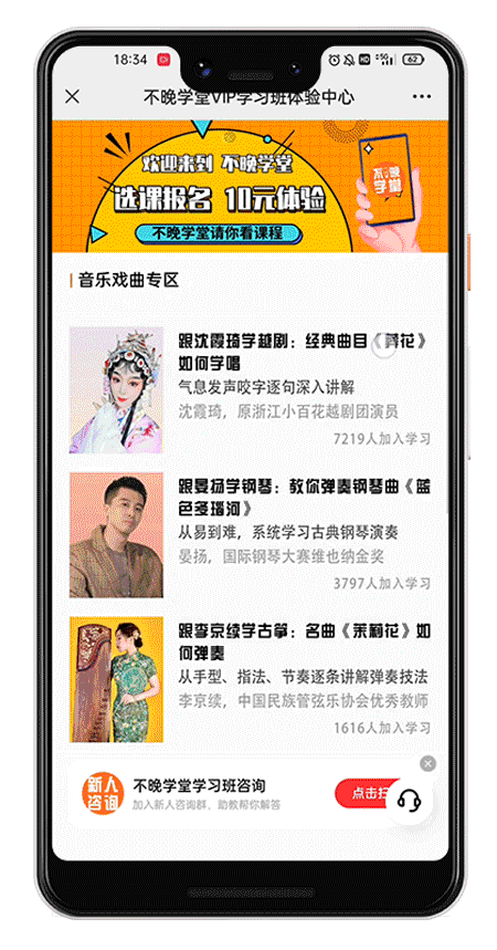 例如:越剧课即将上线,「不晚学堂」会在开班前安排体验课,使用裂变海报的形式分发到越剧社群,成功邀请好友进群,即可获得免费学习的机会。
