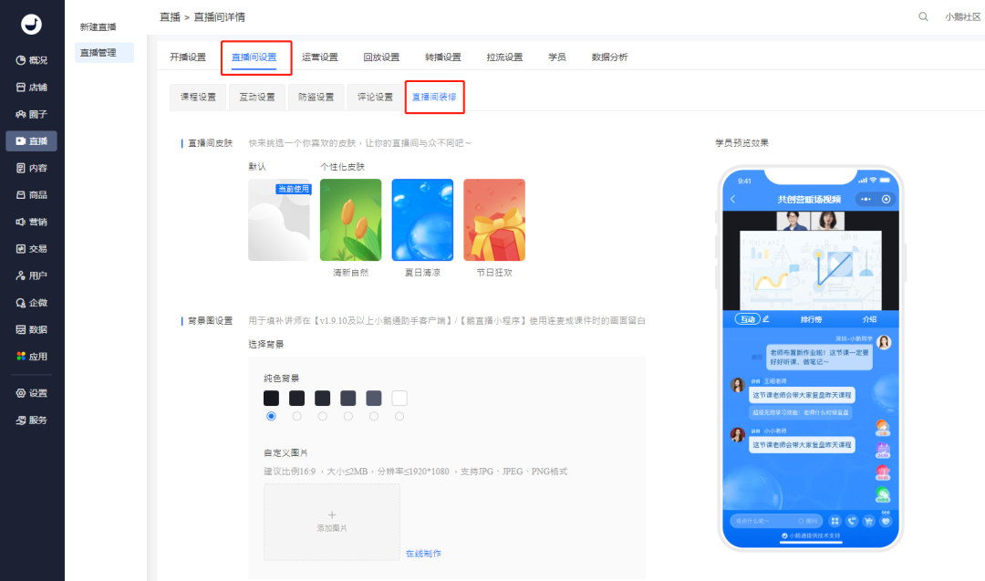 快去【直播间设置-直播间装修】,为你的直播间挑选专属皮肤吧!