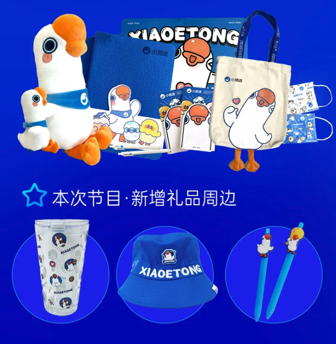 能抽到哪些通通周边呢?这可就多了,有通通大公仔,精装笔记本,鹅jio帆布袋,鼠标垫等常见周边,还有通通渔夫帽、吸管杯等新周边。