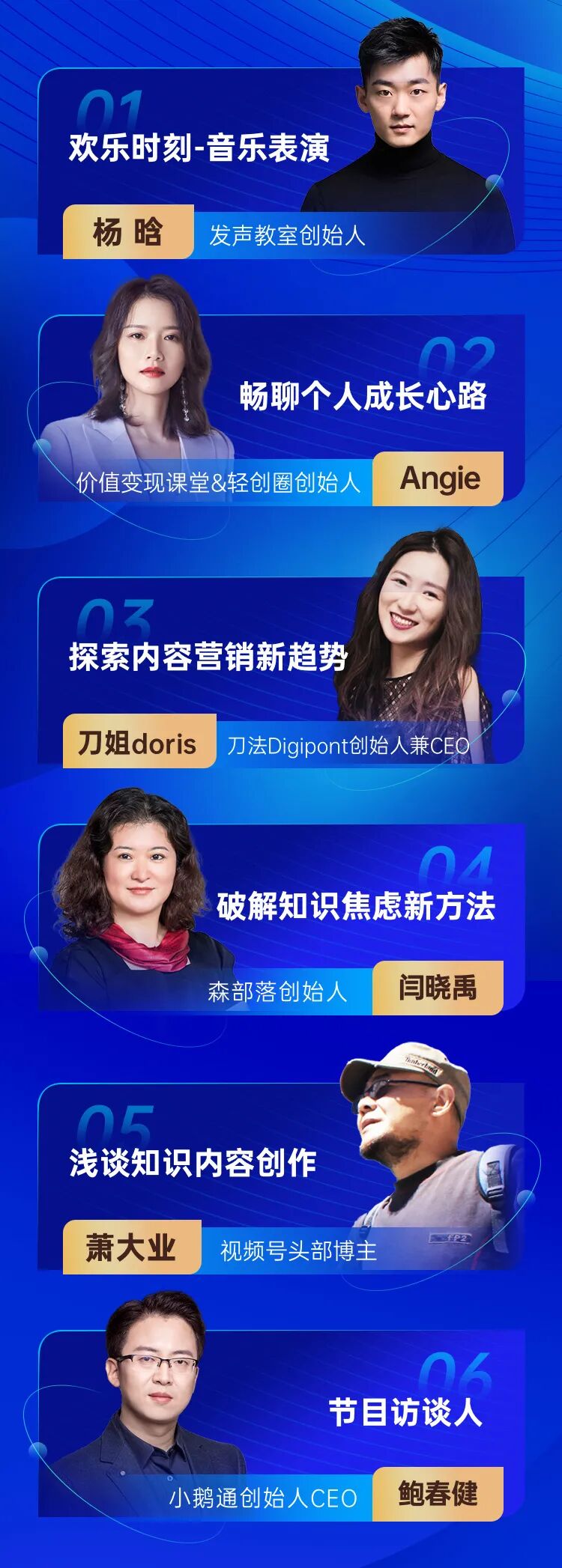 团队打磨了整整一个月,邀请到了五位重量级的知识大咖:有发声教室创始人杨晗老师,畅销书《副业赚钱》作者Angie老师,增长营销专家刀姐doris老师,知名企业培训师闫晓禹老师,还有视频号头部博主萧大业老师!