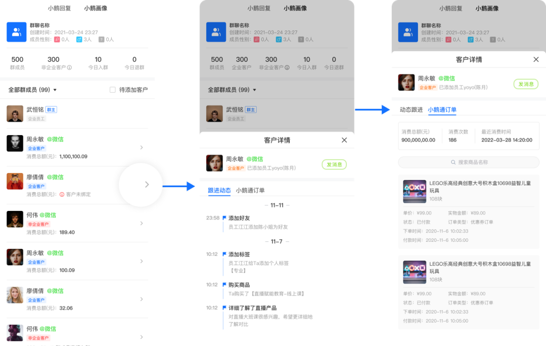 群画像新增显示客户的“店铺数据”,包括客户的跟进动态、消费数据。