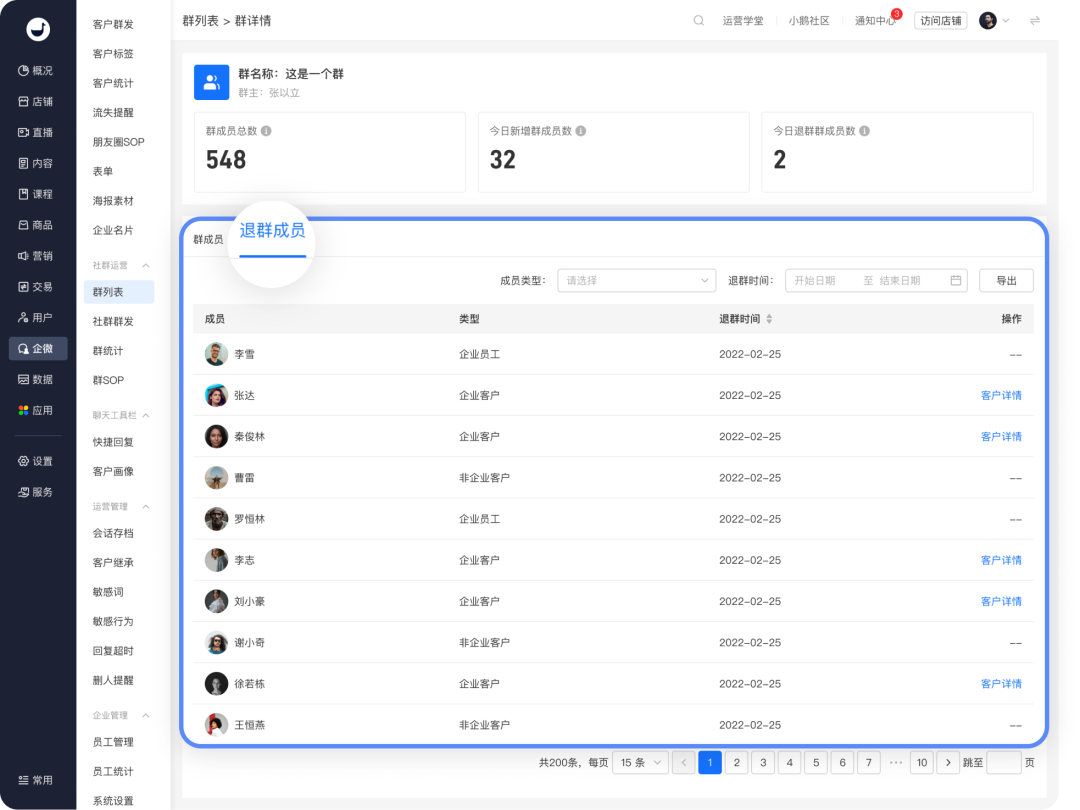 登录管理台,进入企微助手 - 社群运营 - 群列表,找到某个群聊后点击进入「群详情」,即可查看「退群成员」列表。