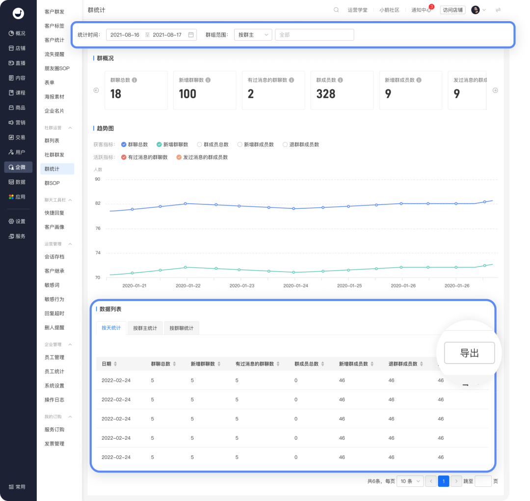 登录小鹅通管理后台,找到【企微助手-社群运营-群统计】模块,体验全新的数据统计维度!
