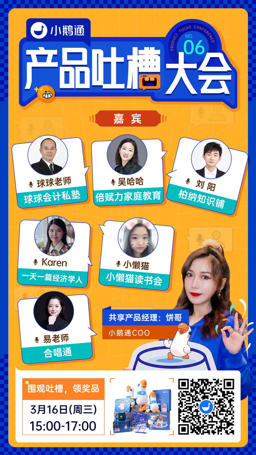小鹅社区上线已有将近半年时间,我们从中选拔了不少对“产品功能”有优质建议的客户,来到《产品吐槽大会》,跟我们在线连麦。