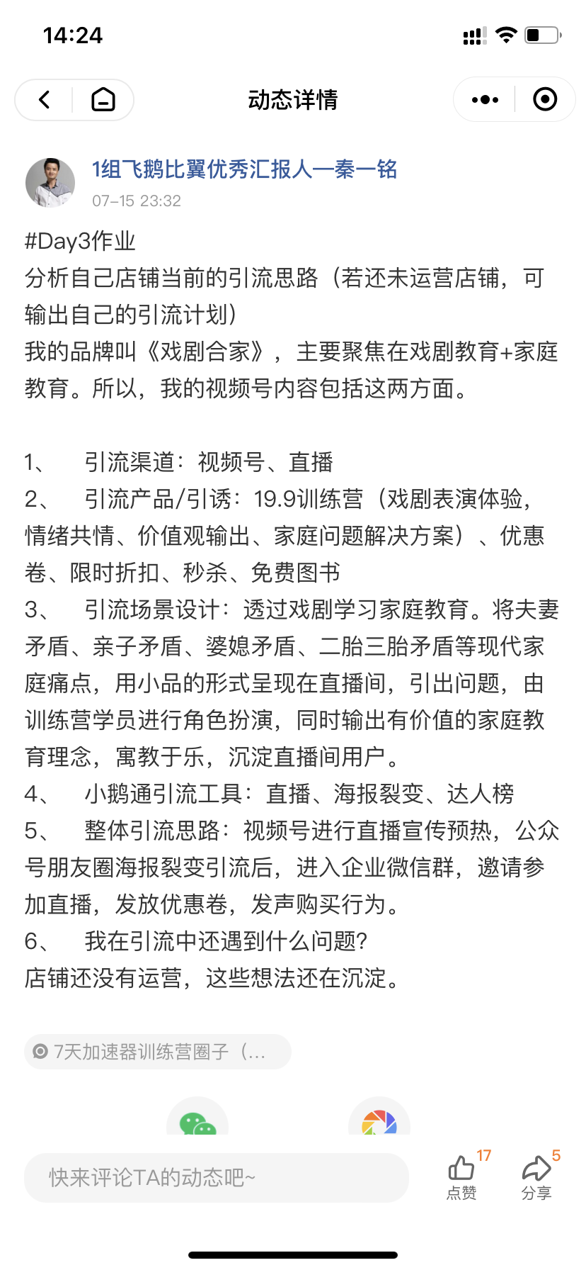 比如第三天的作业是《分析自己店铺当前的引流思路》,秦同学彻底梳理了自己接下来的引流渠道、引流产品、场景设计和整体引流思路。还得到了很多同学的反馈建议。