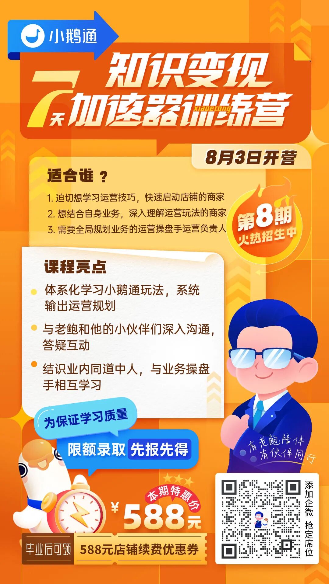 如果您顺利毕业,我们将通过店铺续费优惠的方式,全额返还588元学费!优惠可叠加哟,快叫上团队小伙伴一起报名吧!