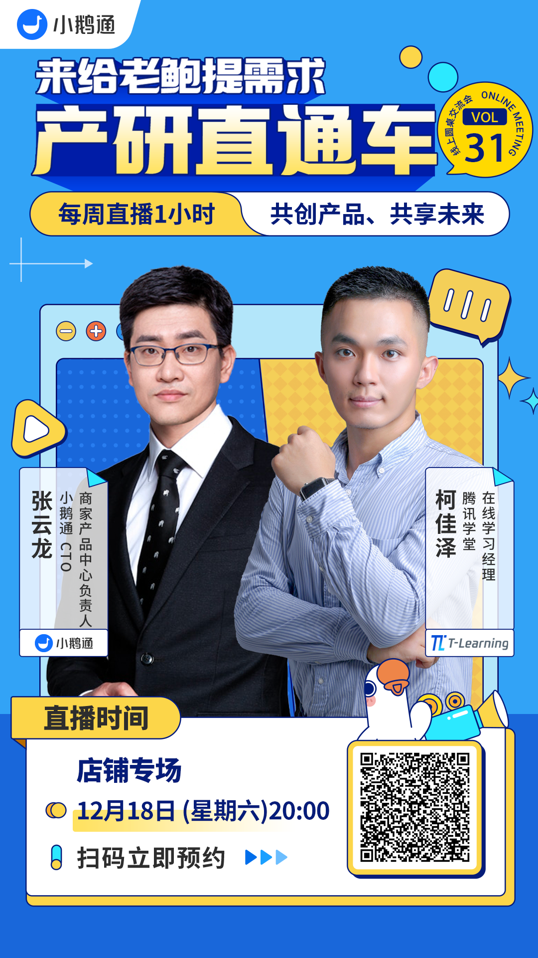 「小鹅通」商家产品中心负责人 张云龙 联手「腾讯学堂」在线学习经理 柯佳泽 在直播间等你,一起畅聊「店铺」需求!