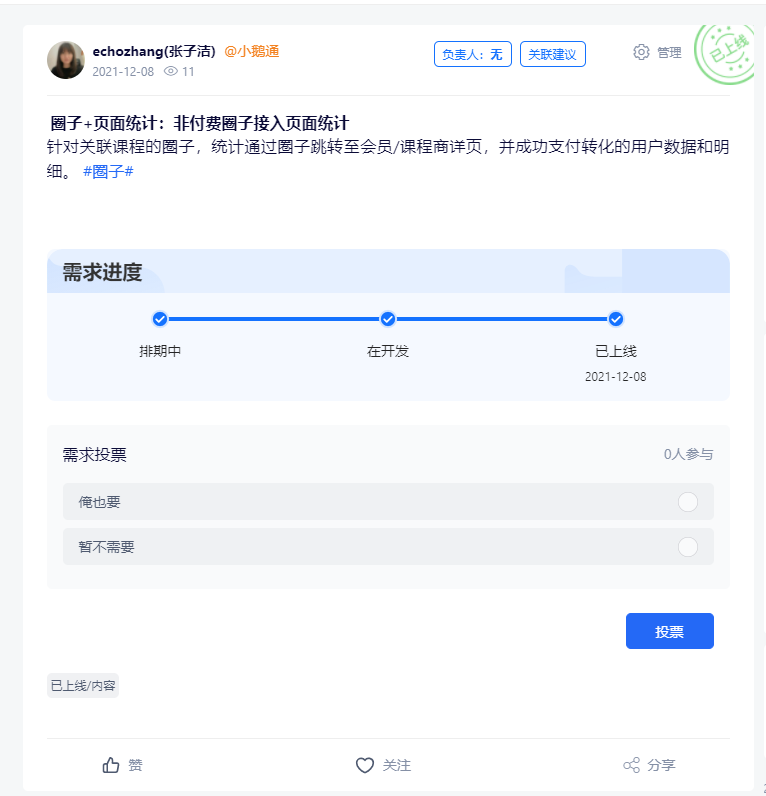 小鹅社区是一个以客户需求为基础,与商家共创产品的交流社区。在这里提需求可以实时查看需求进度,全程透明化。