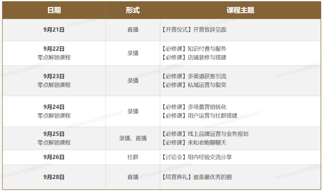 其中6节包含知识付费、获客引流、营销转化、用户运营和社群搭建、线上品牌运营和业务规划等关键内容。