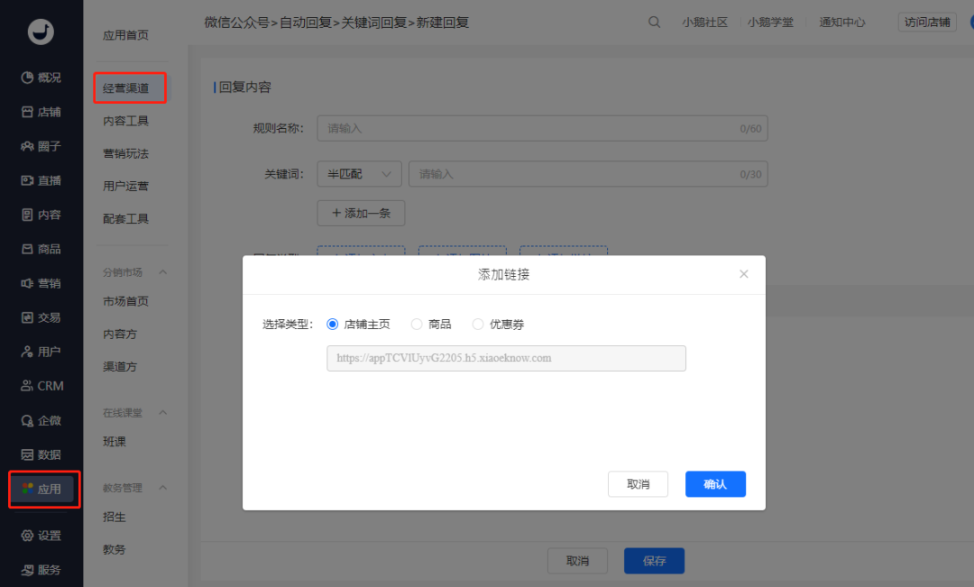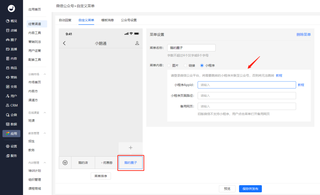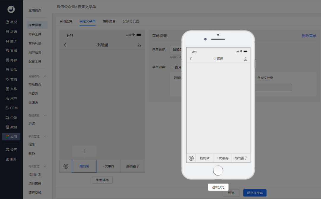 小鹅通支持服务号配置自动回复和自定义菜单,跳转店铺和小程序不是问题!