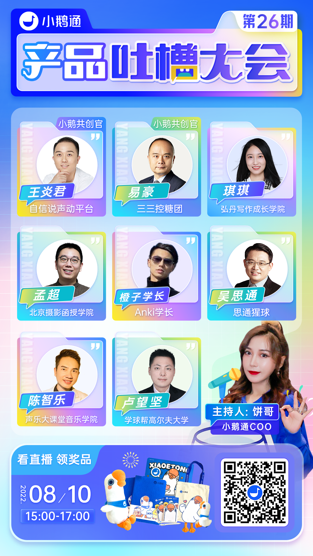 除了吐槽嘉宾,本期直播「小鹅共创官」将持续在线!多视角讨论产品,期待深度交流中出现不一样的产品优化方向!