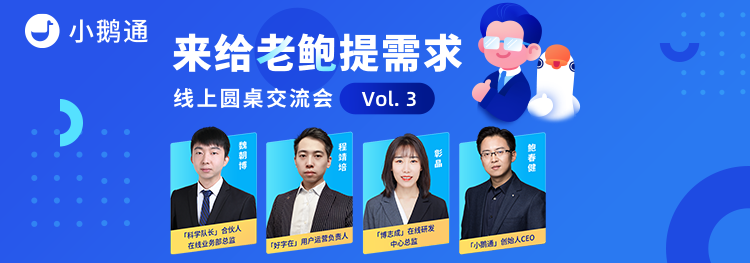 在上一期《来给老鲍提需求》的直播中,我们继续邀请不同行业的重量级嘉宾老师,分别是:科学队长合伙人/在线业务部总监魏朝博、好字在用户运营负责人程靖培以及博志成在线研发中心总监彰晶,和老鲍一起从业务场景出发,共同探索行业未来的发展和机会。