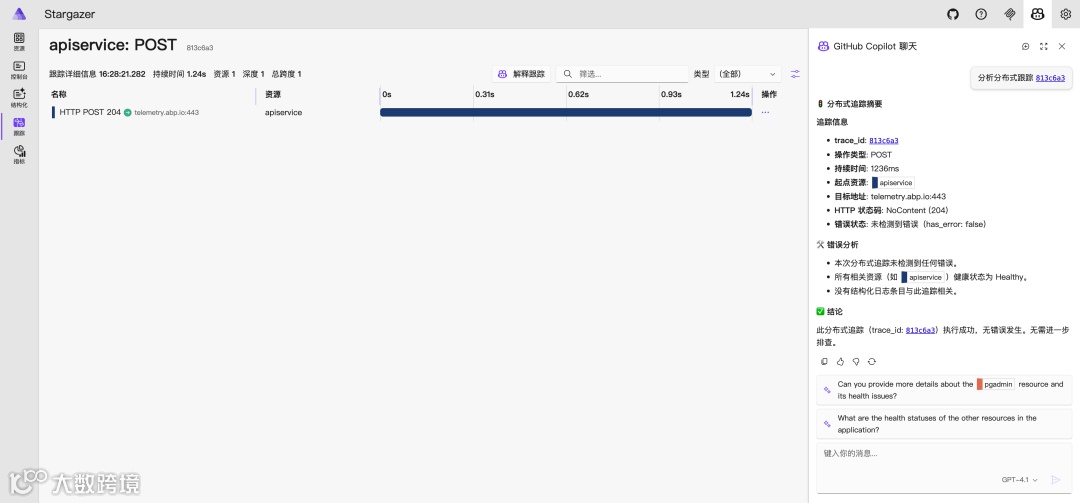 GitHub Copilot在Aspire Dashboard中扮演着AI调试助理的角色,它极大地增强了Dashboard的OpenTelemetry调试和诊断功能。