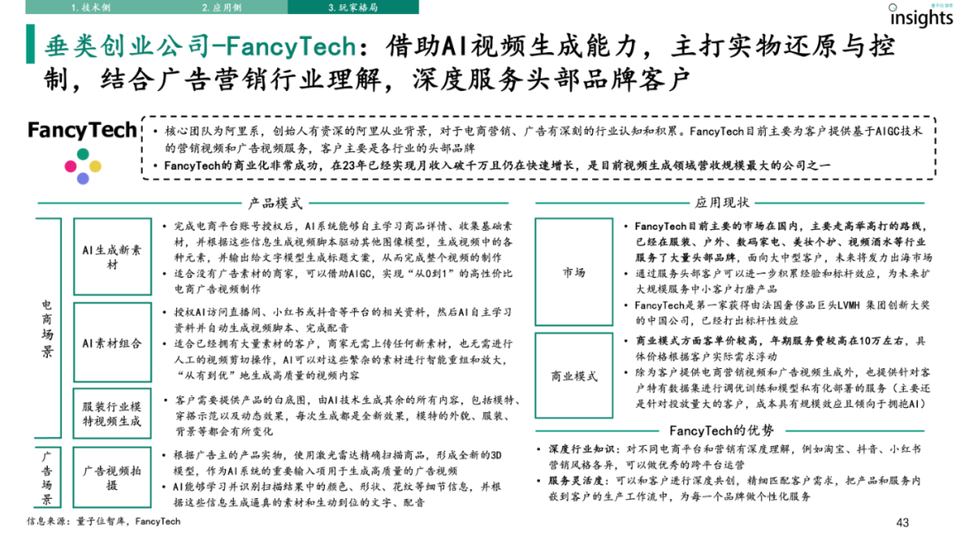 垂类创业公司:目前垂类创业公司的场景主要在视频营销领域,可以快速实现商业化落地,客户主要以各类商家为主。模型层和主流讨论的文生视频差异较大,不追求通用化、创意化的生成效果,主要强调在营销场景下的可控性和稳定性,并针对此类功能做专项的模型增强。另外技术上不一定需要走生成式AI的路线(基于扩散模型、Transformer),基于多模态机器学习、素材的检索生成组合也在很多场景下更能满足需求,但生成式AI可作为素材补充。垂类创业公司和核心优势在于对于营销业务的理解,包括营销视频ROI最大化,跨平台运营以及垂类场景的数据等,对行业knowhow有较高要求。