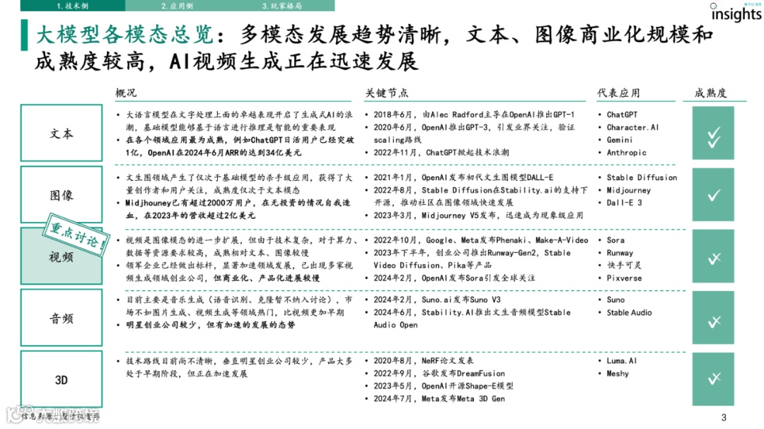 从场景层来看:除垂类创业公司以外,其他玩家都未找到明确的应用场景,大多在实验和探索阶段,C端主要还是一些Prosumer(专业创作者)比如自媒体创作者、艺术家等,B端客户由于模型效果差、可控性弱、和技术接受度等原因渗透较少,只有少量单点的案例。大场景或PMF的确认可能需要等待模型能力进步、产品的打磨、和推理成本的下降,需要一段时间的摸索。