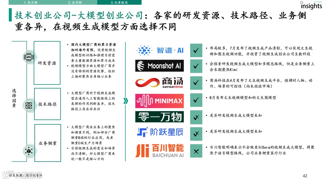 互联网公司:互联网公司的资源充足,从算力上来看,头部互联网公司一般有自建云服务,算力和基础设施层面优势比较大。从数据上来看,有视频内容平台的互联网公司优势较大,例如字节跳动、快手等公司,视频内容的推荐系统积累大量的视频数据,标注质量较好,分类细致准确,可以大幅助力模型训练。目前国内互联网在模型层和产品层追赶速度较快,海外互联网公司由于内容安全和的数据版权问题受到掣肘较大,产品化进展相对缓慢,但实验性项目和前沿研究较多。