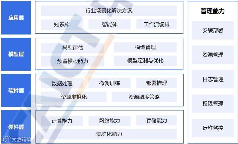 应用层最终落地,提供API、可视化界面及行业模板(如智能客服、文档生成),并结合检索增强生成(RAG)技术提升准确性。