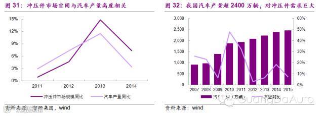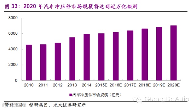 中国汽车产销基数庞大,2014年产量达2372万辆,为全球第一。冲压件市场与整车产量高度相关,2014年国内市场规模达5931亿元[k]。假设每辆车1500个冲压件、未来五年产量复合增速3%,预计到2020年,全国汽车冲压件市场规模将达7030亿元[k]。
