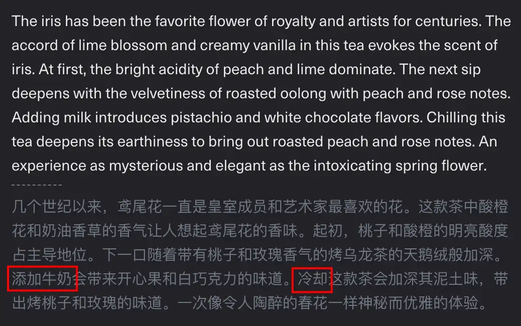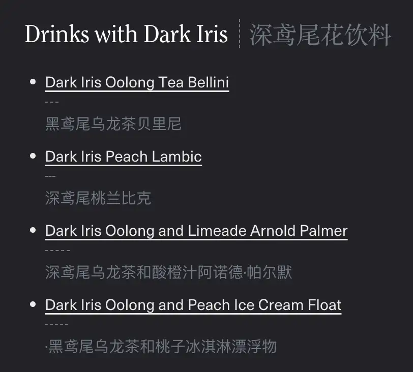 比如Dark Iris这款,品牌概括它的感觉像Georgia o'keeffe(美国艺术家)的花朵;同时描述了加牛奶饮用和冷藏饮用分别产生的特殊风味。