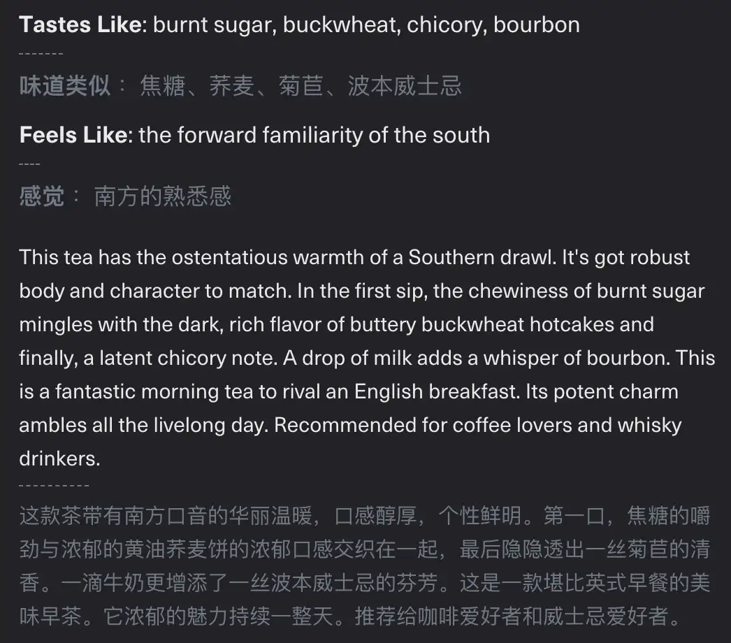 Low Country的味道是焦糖、荞麦、波旁威士忌和菊苣的混合,茶能喝出酒的味道来,外网评论还说这是用做鸡尾酒的思路做茶。