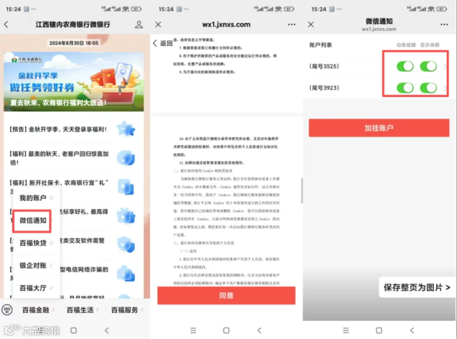 搜索并关注“江西辖内农商银行微银行”微信服务号→点击“百福金融”→“微信通知”→实名认证完成后→可以选择是否“接收动账消息提醒”及“显示余额”。