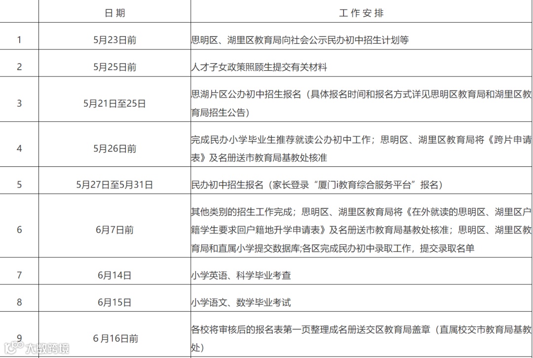 1.思明区、湖里区初中招生报名时间为5月21日(星期三)至5月25日(星期日)