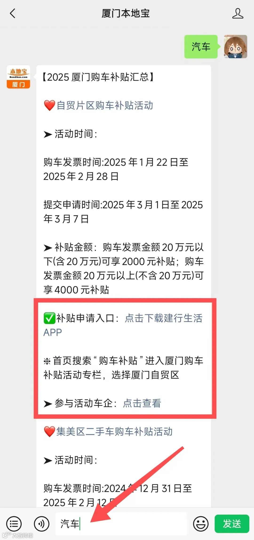 😘温馨提示:在厦宝聊天对话框内回复【汽车】,即可获取集美区二手车购车补贴申请入口+活动车企名单!