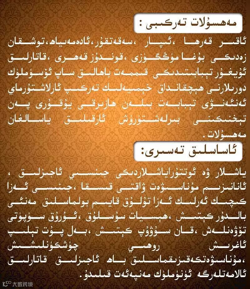 تەركىبى: زەپە،بۇغا مۈڭگۈزى، قۇشقاچ مېڭىسى، سەقەنقۇر ئادەمگىياھ ، سۆئلەپ مىسرى، تۇشقان زەدىكى ئىپار قاتارلىق قىممەت باھالىق تىبابەت ئۇسۇملۇك جەۋھىرىدىن ئالاھىدە تەييارلانغان بولۇپ، ئىشلىتىش ئۇسۇلى: مۇناسىۋەتتىن بىر سائەت بۇرۇن قايناقسۇ ياكى ئىسسىقلىق چاي بىلەن بىر تال يىيلىدۇ. ئىككى،ئۇچ كۇندە بىرتالدىن ئىستىمال قىلنىدۇ تەبئىي بۇلۇپ كۆندۈرۈپ بېقىندۇرۇپ قۇيمايدۇ،