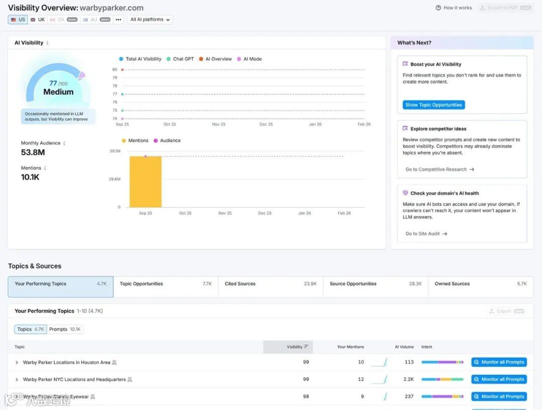 Semrush AI可视化工具包可追踪品牌在大型语言模型(LLM)中的提及情况,展示用户常向AI提问的相关问题、品牌被引用频率,并提供优化建议。