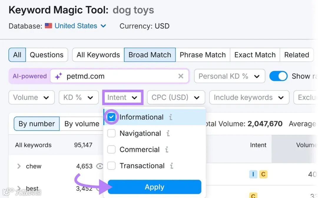 使用“信息性”意图筛选,聚焦用户求知类搜索;启用“问题”筛选,挖掘问答式长尾词,丰富内容选题库。
