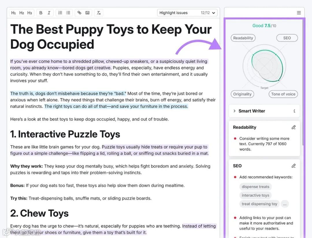 根据右侧建议调整内容,提升排名潜力。还可使用智能写作者功能进行文本重述、简化或扩展,加速创作流程。