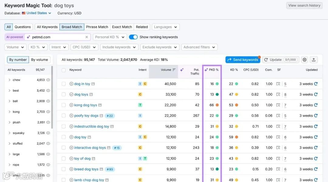 结合Semrush的Keyword Magic Tool可进一步验证关键词表现,查看个人关键词难度(PKD)、搜索量等指标,优先选择PKD低、搜索量适中的词,提升排名机会。